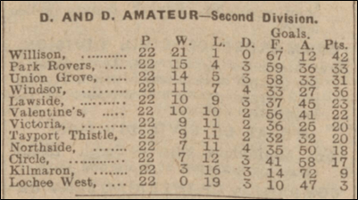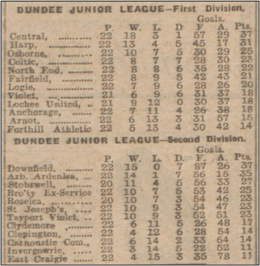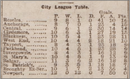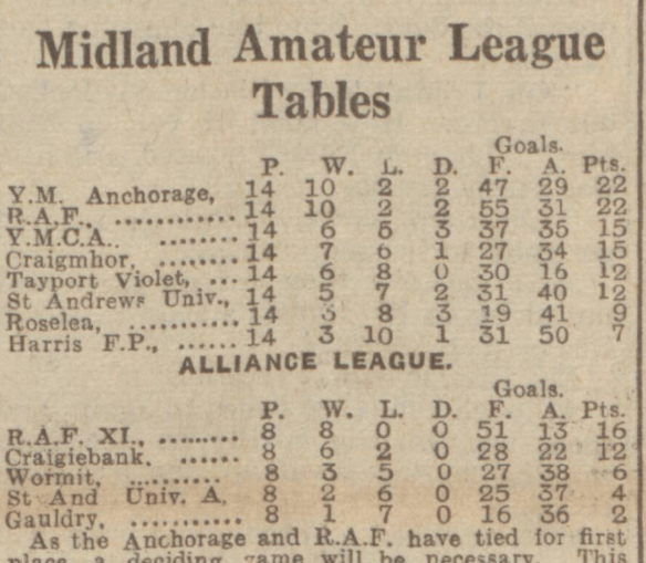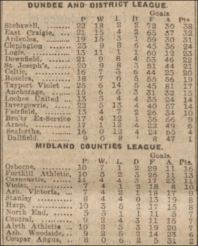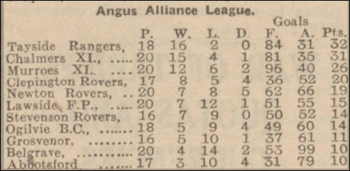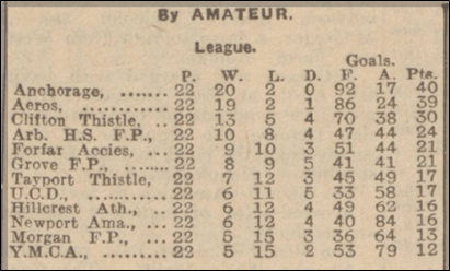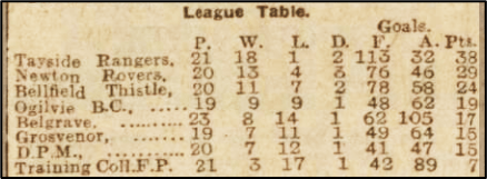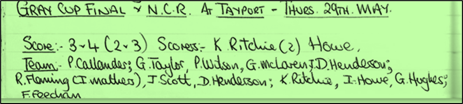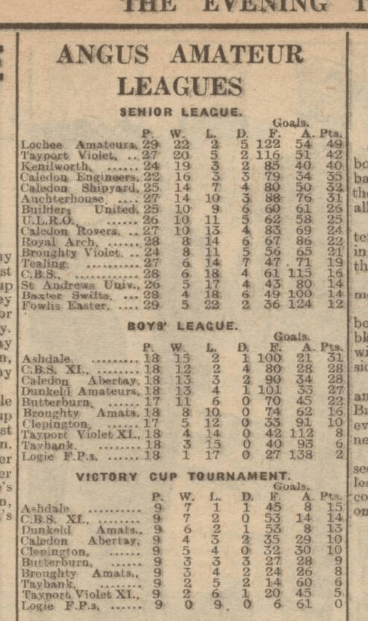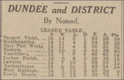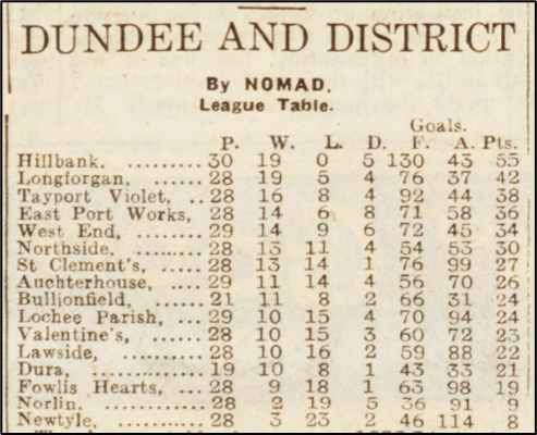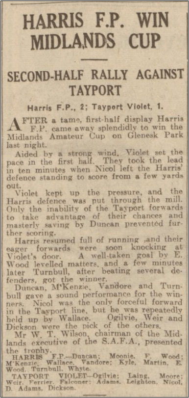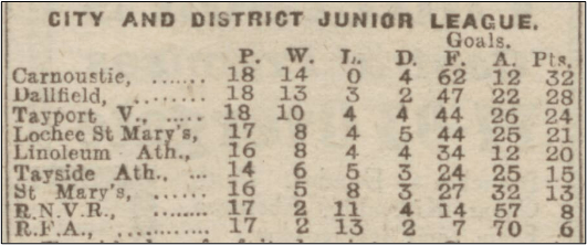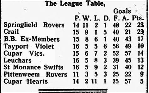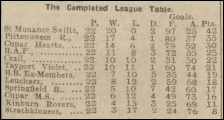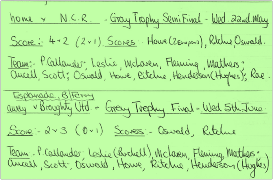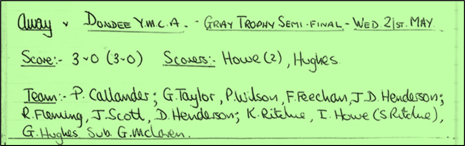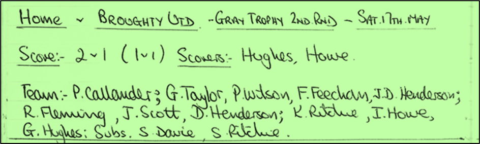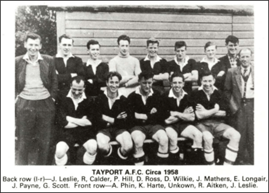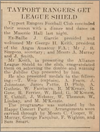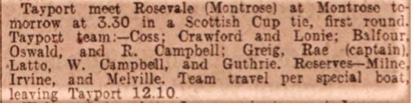 Tayport FC’s usual line-up that season was Heggie; Campbell and George; N.Oswald, Cowie and Guthrie; Keddie, J.Rae, Gray, Campbell and Greig.