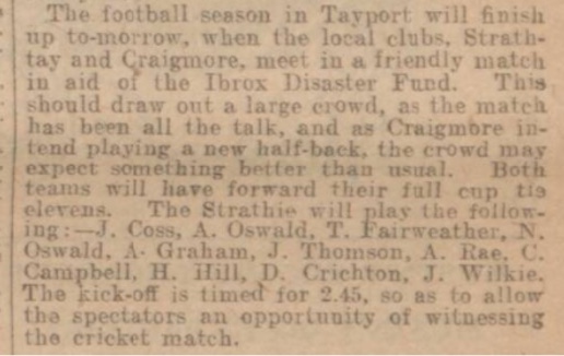 May 1902.Tayport’s two Juvenile teams played a benefit match in aid of the Ibrox Disaster Fund.