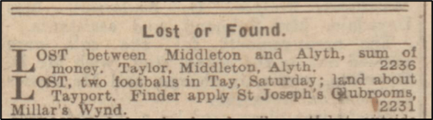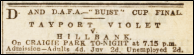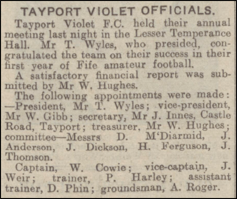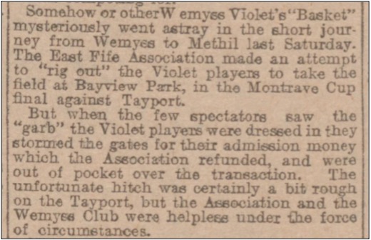 ‘The principal business was the fixing of the postponed final tie, which was the result of Wemyss Violet losing their hamper with the necessary uniform. The Tayport representative informed the meeting that his club could not again undertake to travel to Methil unless the players were guaranteed full railway fares…It was eventually agreed to grant Tayport half railway fare if the “gate” should realise £7 and full railway fares if the “gate” was £12’.