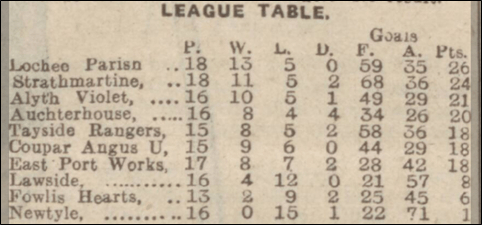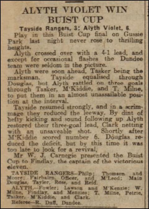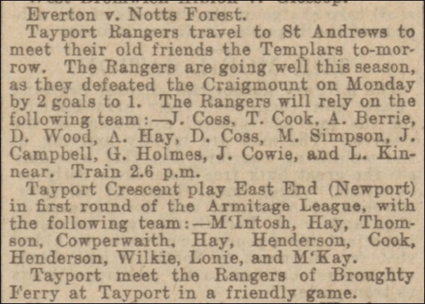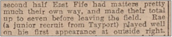 On this occasion Tayport lined up Coss; Cowley and Oswald; Campbell, Cowie and Butters; A. Rae, Wallace, Gray, J. Rae and Wilkie.