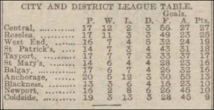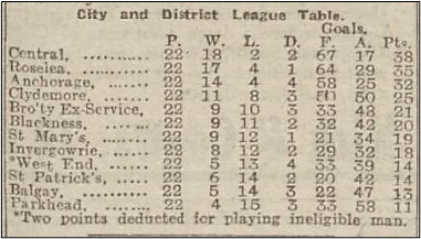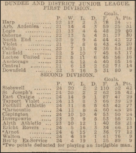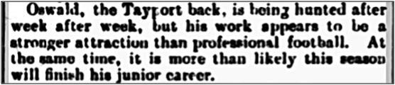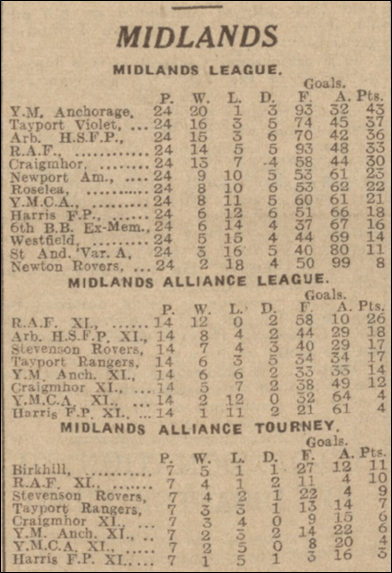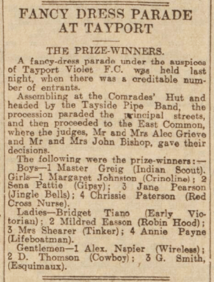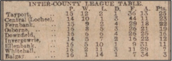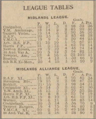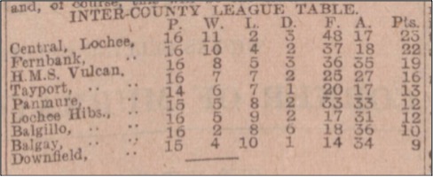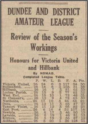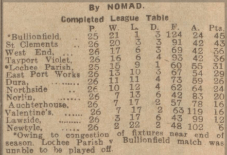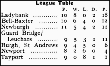 Tayport’s regular squad during the season was Coss, Heggie; Lonie, Crawford, Balfour, E.Oswald, George, Connelly, Greig, Mills, Campbell, Rae, Guthrie, Henderson, F.Oswald.