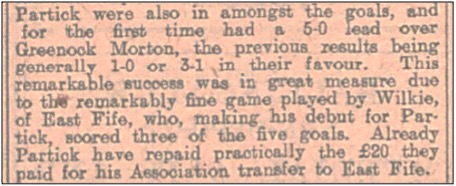 John Wilkie signed for East Fife but he wasn’t long at Bayview before Partick Thistle were in for his transfer. Described by East Fife FC as ‘the Junior capture of the season’, Wilkie moved to the Glasgow side at the end of August