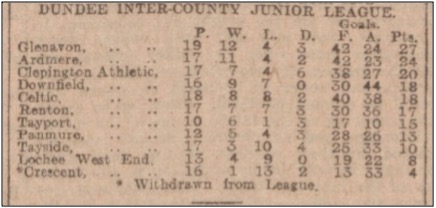 In 1907/08 Tayport FC, the 1st Class Juniors, would rekindle the Scottish Junior Cup excitement of 1905/06 [see ‘Tayport in the Scottish Junior Cup’ elsewhere in the Archive] but there was still no place for the club in the closed shop of the Dundee Junior League therefore friendlies and cup ties would be the order of the day. In December however, following the withdrawal of Victoria Athletic, Tayport accepted an invitation to join the Inter County League. Playing catch-up, they quickly made their mark, collecting both points from their first game against high flying Ardmere FC. But they were never going to complete the season and this was how the table looked at the end of May 1908