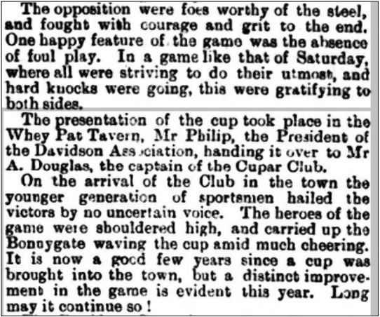 As a point of interest, the Davidson Cup semi-final victory v Cupar Rovers was the first game to be played on the Carthaugh [opposite Fluthers car park], courtesy of Cupar Town Council.