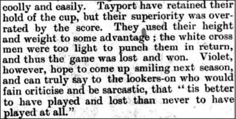 As well as their Scottish and East of Fife Cup exploits, Tayport were finalists in the previous season’s unfinished Armitage Cup and Davidson Cup and were also runners-up after extra time to Dundee West End in the Courier Cup, a match reported as “brilliantly contested all through, neither side sparing themselves, and ding-dong went the play all the time”. It was one of the matches of the season locally, drawing ”a good gate of £16” [£2,300 in 2022 money].