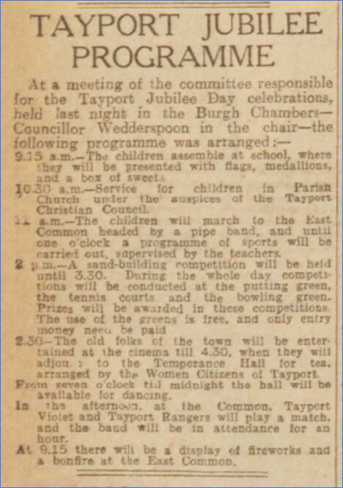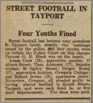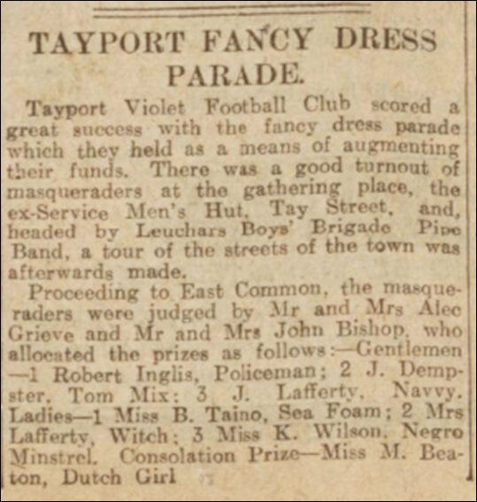 - The Scottish Football Association withdrew their permission for Tayport to take part in the annual international tournament in Belgium as it was not a tournament officially recognised by the Belgian FA. Tayport were already booked up with most of the first team squad going and having already paid their £35 [£375 in 2025 value]. Matters must have been resolved as they went anyway!