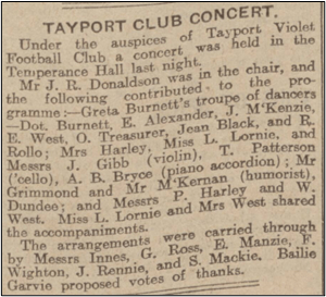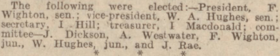 - Office bearers elected were Chairman – D. Hughes; Vice chairman – A.Oswald Snr; Secretary – A.J.Oswald; Treasurer – W.R.S Kemp. The committee elected was – E.Simpson, F.Bremner, A.D.Oswald, A.Ritchie, I.Mathers, A.Robertson, I.Cougan, I.Rae, E.Stewart, J.Lindsay