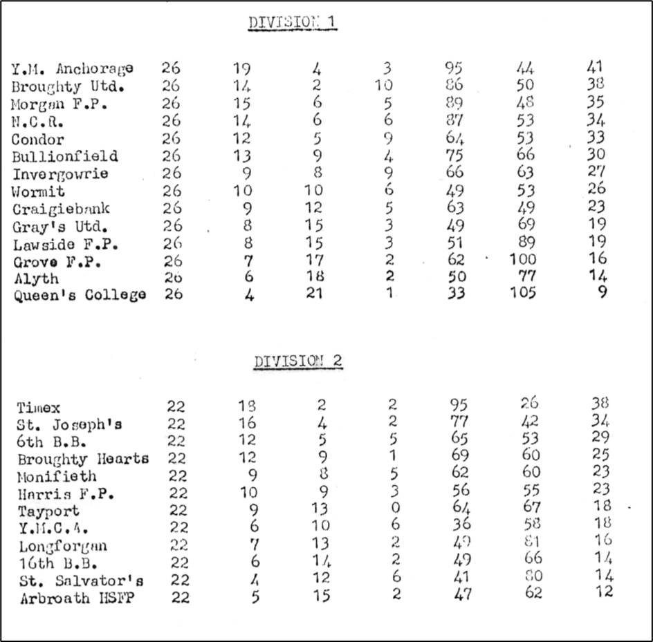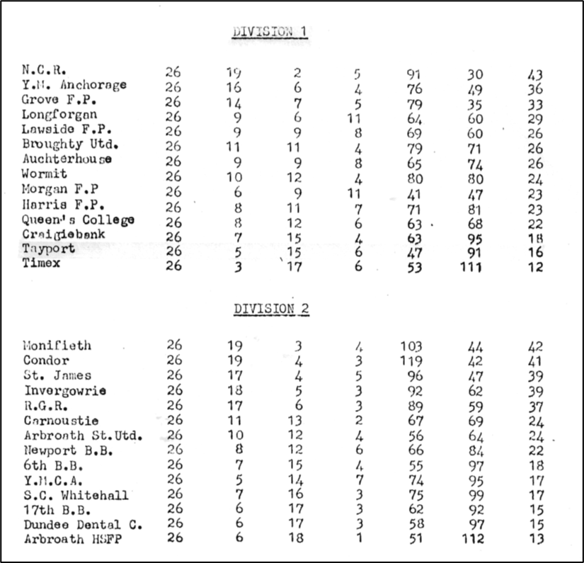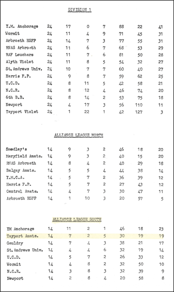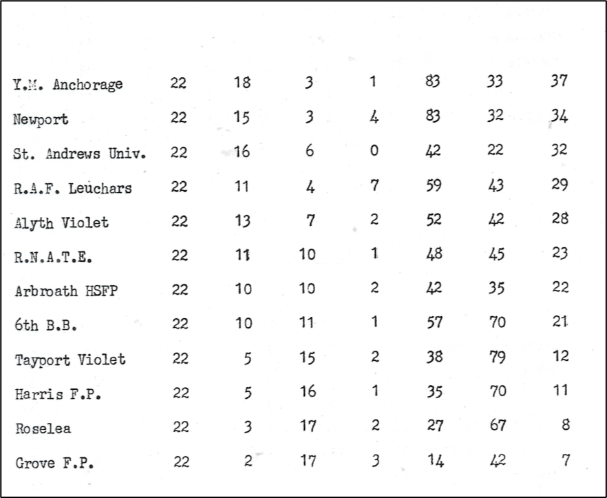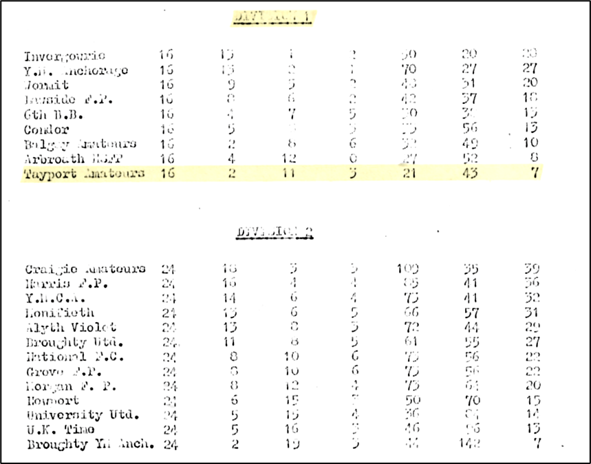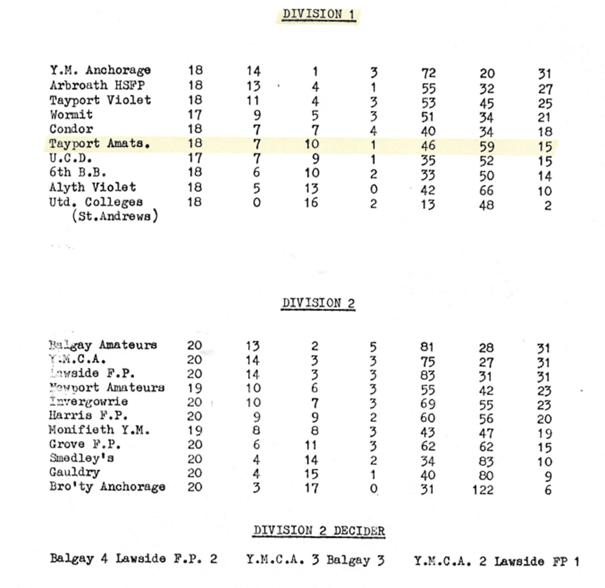 - At the AGM, Alex Dargie, manager of the Tayport Arms was appointed an Honorary Vice President. The chairman, vice-chairman, secretary and treasurer were re-elected. There were 13 nominations for 10 committee places and after a ballot, the following were elected – Messrs E.Stewart, A.Robertson, J.Lindsay, A.D.Oswald, I.Cougan, M.Lawson, F.Bremner, I.Rae, E.Simpson, I.Mathers were elected.