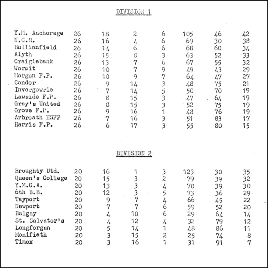 Frank Feechan (28), Frank Leslie (23), Lindsay Ancell (22), Albert Oswald (22), Phil Callander (16), Keith Ritchie (14) Top Scorers – Ian Howe 30; Gordon Hughes 20; J. Doug Henderson 15