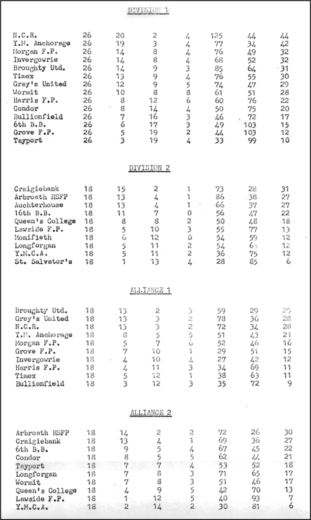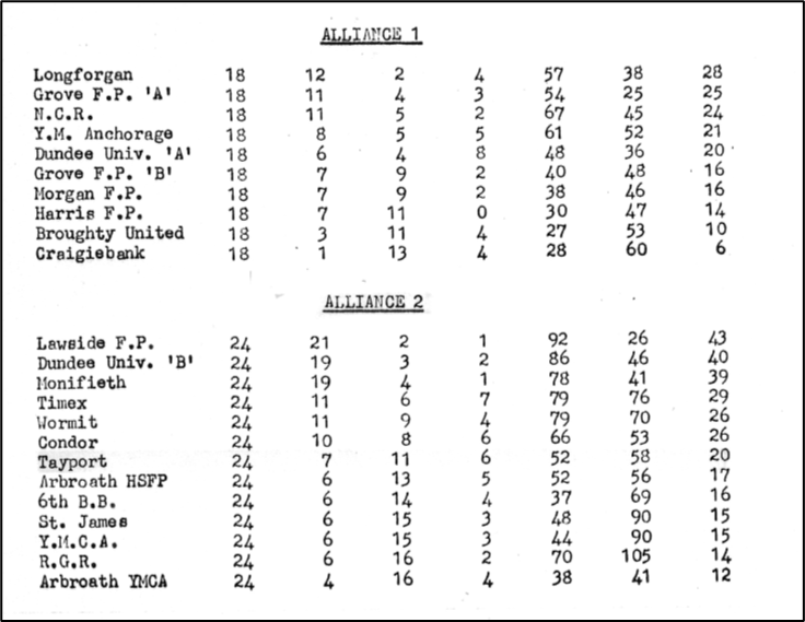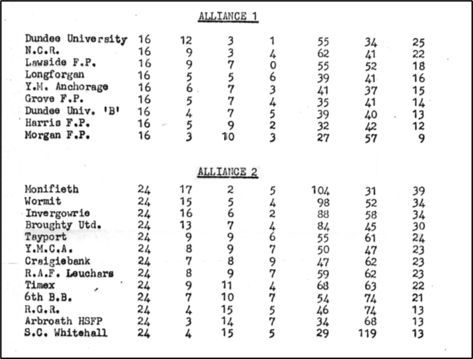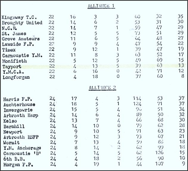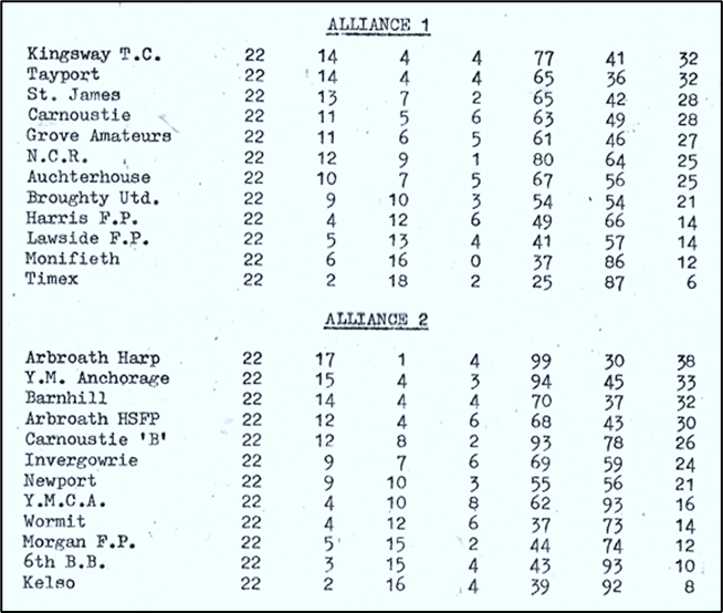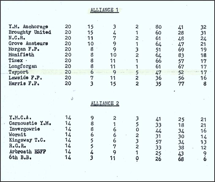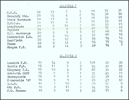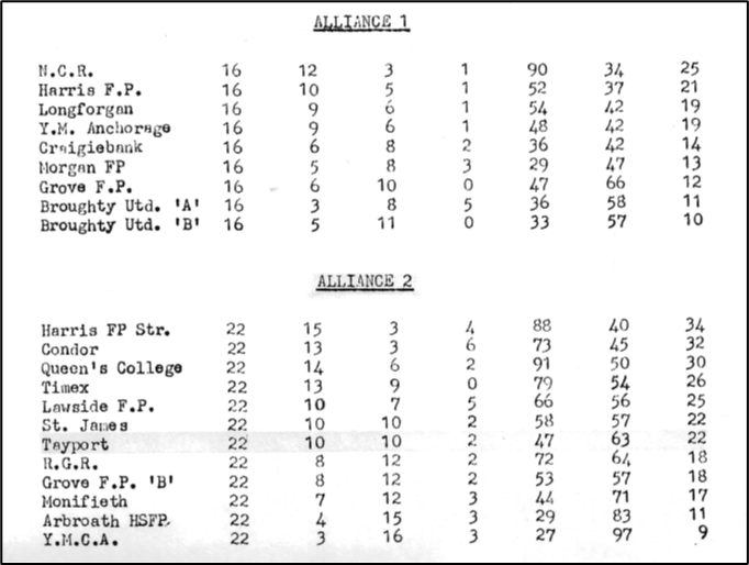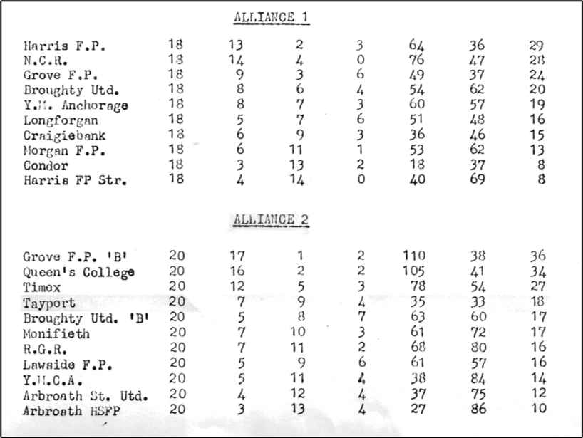 The Alliance XI had their best ever League placing and were pipped for what would have been the club’s only Alliance Division One championship by 0.07 of a goal (goal average in those days). They had made a great effort, however, winning their last game v Broughty United by 7-0 when another two goals would have secured the title! Once again there was no success in either Alliance cup competitions.