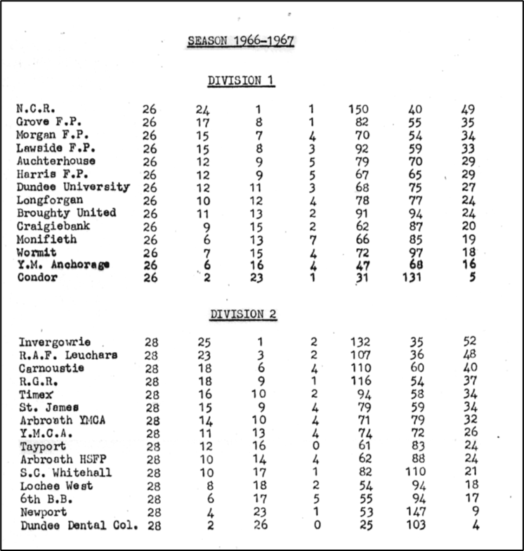 Other in double figures were: – Albert Oswald (15), Doug Henderson (13), Maurice Milne (11), Lindsay Ancell (11), Gordon Gray (10)
