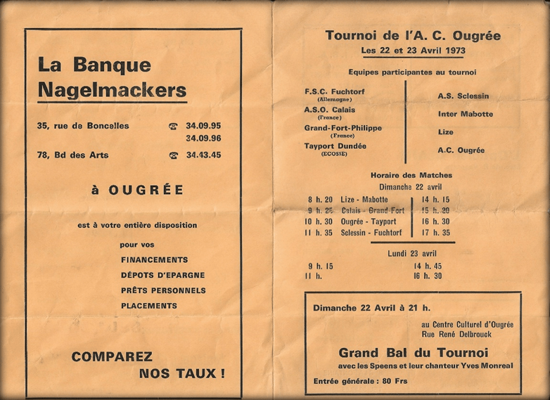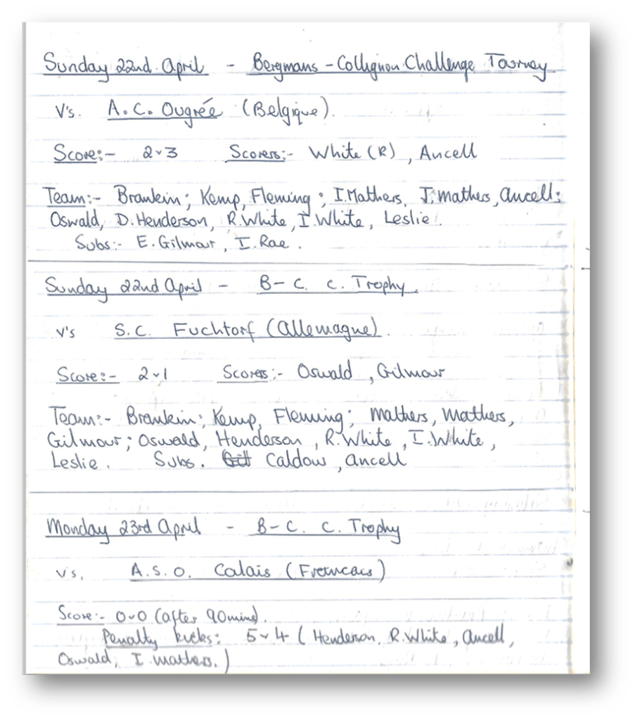 In Belgium at the end of March, Tayport finished fifth, beating Italians Roanna Milan 2-0 (og, Oswald), losing to Hydro Dynamo 1-3 (Dave Henderson) but finishing with a 1-0 win over FC Lize (Dave Henderson). Tayport fielded Phil Callander, George Taylor, Stuart Davie, Graham McLaren, Frank Feechan, Frank Leslie, Jim Scott, Dave Henderson, Doug Henderson, Ian Howe, Peter Wilson, Gordon Hughes, Albert Oswald, Ian Rae.