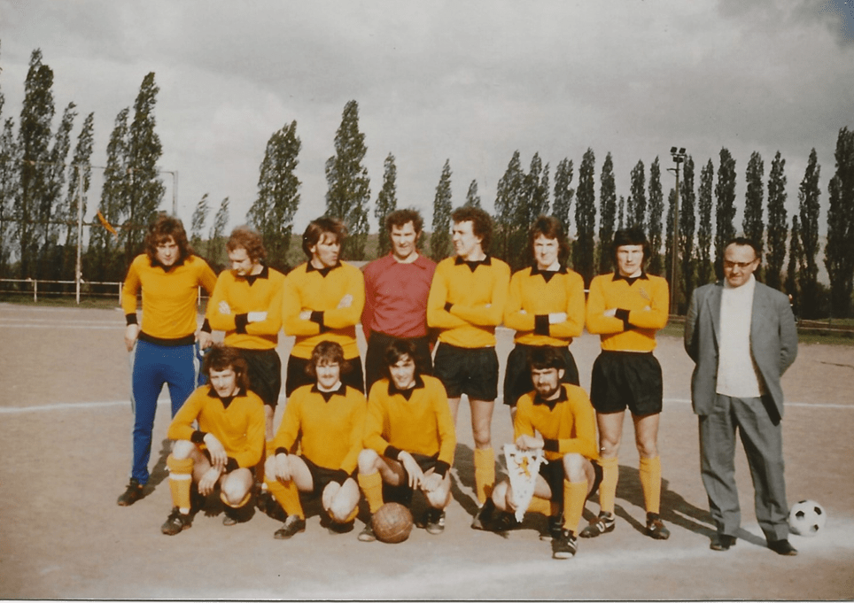 A Tayport line-up during the Belgian tournament with Ougree’s Mayor. The well-used pitch was more like the Sahara Desert. Tayport back (l-r) Frank Feechan, Lindsay Ancell, Jim Scott, Phil Callander, Graham McLaren, Ron Fleming, Ian Mathers. Front – Frank Leslie, Ian Rae, Ian Howe, an invisible player and Doug Henderson with our pennant