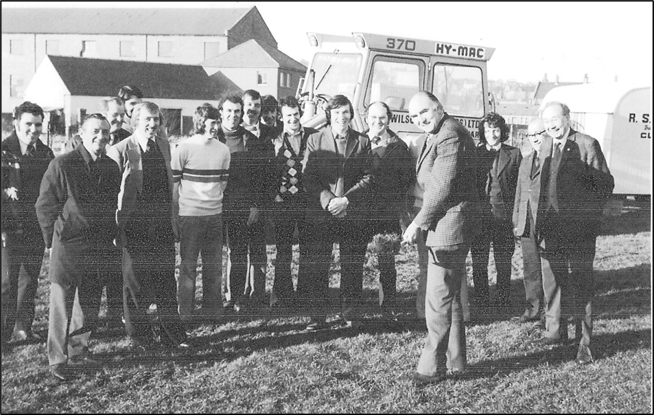 Pictured from left are Fred Bremner, Davie Hughes, RS Wilson, Doug Henderson, Abby Oswald, Stewart Ritchie, Ernie Simpson, Alastair Oswald, Jim Lindsay, Alex Ritchie, Ian Mathers, Andy Robertson, Provost Pow, Iain Cougan, Albert Oswald Snr and Burgh Surveyor Andrew Peter. Note the now demolished Scott & Fyfe factory and offices in the background