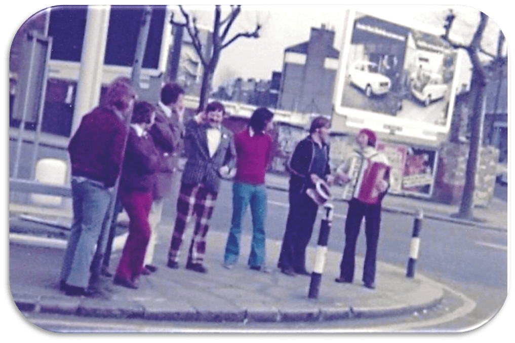 The team bus broke down in London on the way back from Belgium to Tayport. Whilst waiting for a replacement bus, Bobby Jackson (Le Boab as the Belgians knew him) with accordion and Jim Scott with the hat, indulged in a bit of busking! Others from right, John Hackett, Andy ‘Bunt’ Robertson, ‘Spider’ McLaren, Frank Leslie and Gordon Brankin.