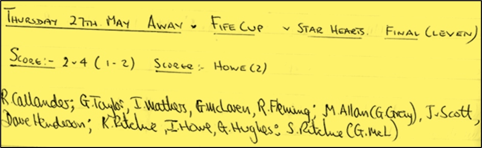 In the Fife Amateur Cup, there was an unprecedented winning run, eliminating Argos United (Kirkcaldy) after a replay, Methilhill Strollers (6-0), Pitlessie (4-0) and Marion United (5-3) in the semi- final before falling at the last hurdle where Star Hearts exacted revenge with a 4-2 win at Leven Juniors ground.