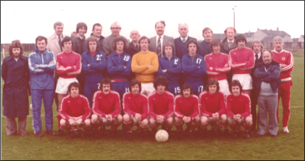 Part of the Midlands AFA’s 50th Anniversary celebrations in 1976, was a match between a Midlands AFA select and Queens Park FC at Claypotts Park. Tayport FC supplied the match strip, tracksuits and two of our players were selected to play, Ian Mathers, 3rd left in middle row and Dave Henderson extreme right in front row. The Midlands Executive are back row (l-r) George Buckman, Stuart Finan, Sandy Mackie, Tom Elder, George Sellars, Bruce Ralston, unknown, Ed Yule and middle row extreme left Joe O’ Brien and 3rd from right Albert Oswald.