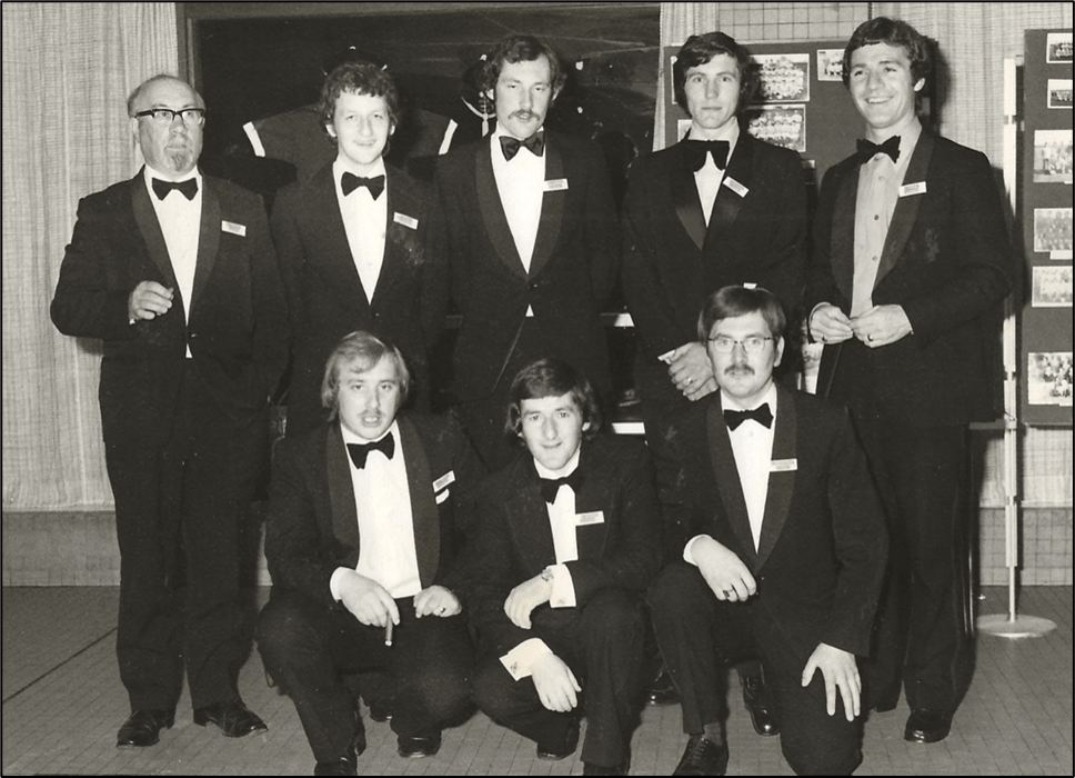 The Tayport FC representatives at the Midlands AFA’s 50th Anniversary Dinner in 1976.Baco (l-r) Albert Oswald snr., Iain Cougan, Matt Lawson, Ian Mathers, Bertie Thoms. Front – Albert J. Oswald, Robert Watson, Andy Robertson.