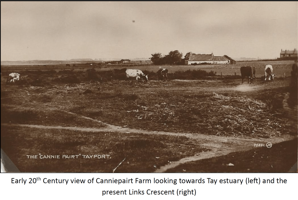 Since 1851 the NBR railway track from the south had run along the edge of the Canniepairt Farm, through what is now the spectators’ match enclosure, on its way to its terminus at Tayport harbour and the ferry across the Tay. This and the Factory Burn effectively restricted access to Canniepairt to what is now Links Road North and the Mill Bridge which crossed the railway and linked Shanwell Road to Shanwell Road South.