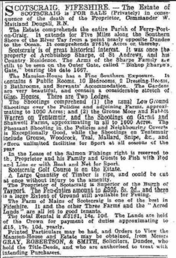 Following the death of William Maitland Dougall in 1916, the decision was made to sell the Scotscraig family estate, which pretty much covered the entire parish of Ferry-Port-On-Craig [Tayport].