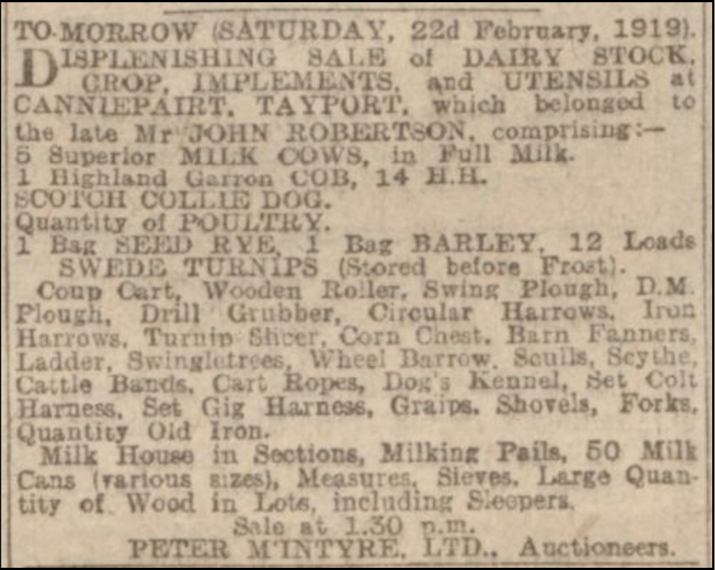 Over future years, Dundee Council, having realised their folly of trying to invade Tayport, would sell off parts of the now unwanted Scotscraig Estate. However, the Canniepairt was a part they wished to retain. It was during this period that signalled the end of the Canniepairt as a farm. Francis and Jessie Oswald (née Robertson), had taken over the tenancy from Jessie’s father but they weren’t farmers and the decision was made in 1919 to sell off the farm’s contents. The Oswalds were now the sole tenants at Canniepairt.