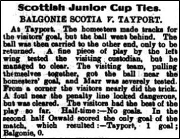 Unfortunately, there are no details of this win which put Tayport into the 3rd round. Sadly, Tayport were without their regular right back James Wilkie who had succumbed to an illness and died earlier in the month.