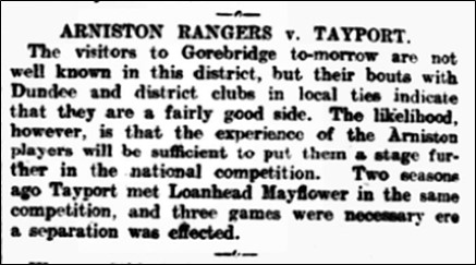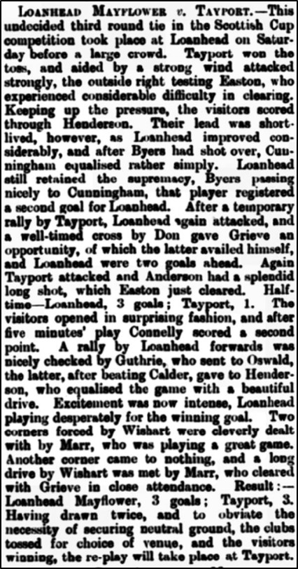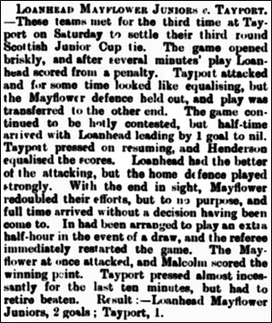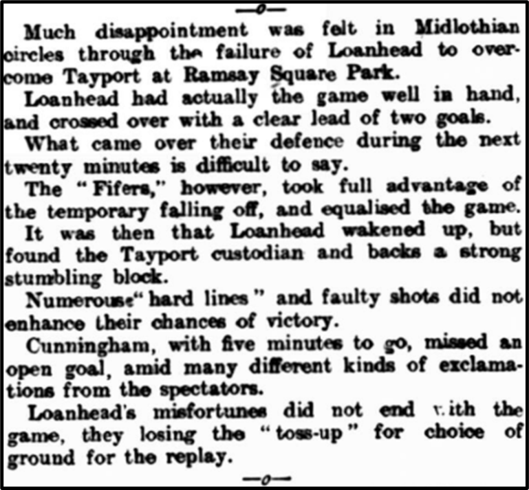 The Midlothian press reported that Loanhead were“undertaking a long journey to Tayport but have exceedingly high hopes as to the ultimate issue of the tie. Tayport are to us an unknown quantity but the experience of the Loanhead eleven will probably carry them to victory”m to victory”